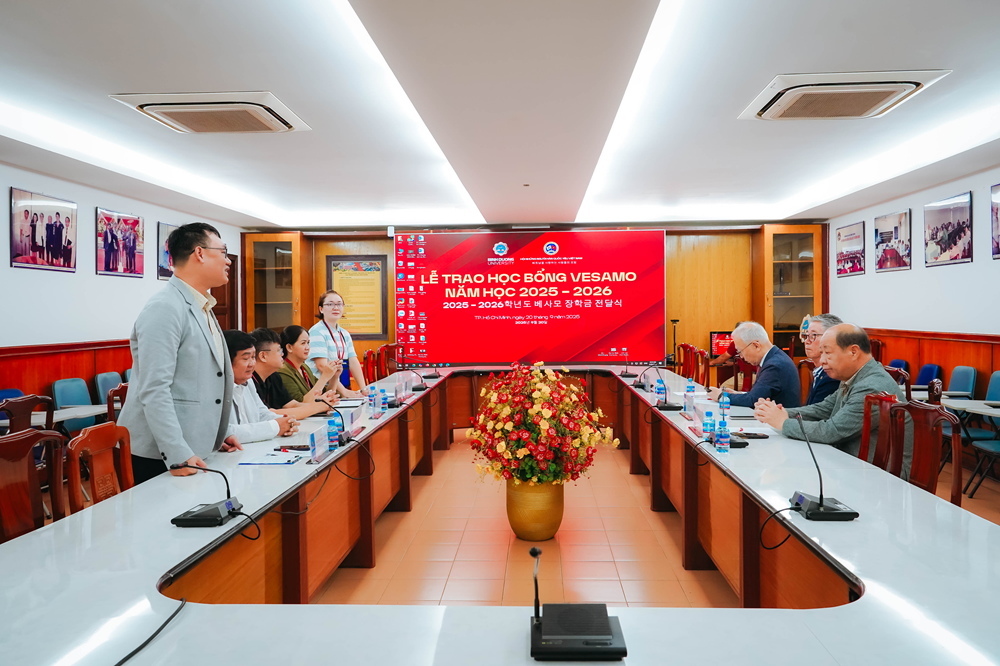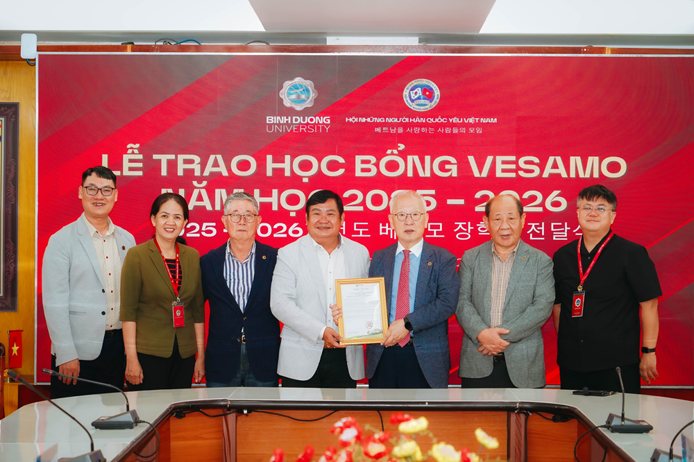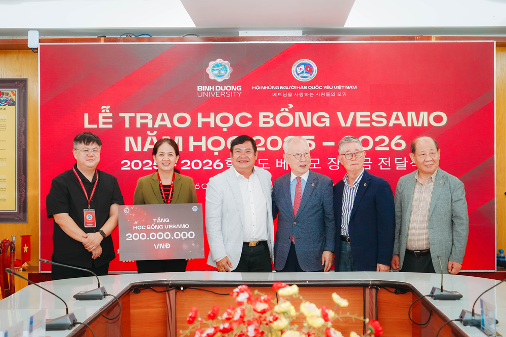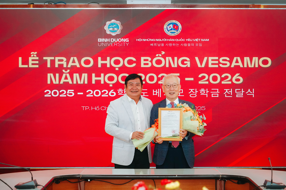 Từ 9h00, thứ Bảy, ngày 20/9/2025, tại Phòng họp A1, Trường Đại học Bình Dương đã diễn ra lễ trao tặng học bổng của Hội người Hàn yêu Việt Nam (Vesamo) cho sinh viên vượt khó học giỏi. Đây là lần trao học bổng đánh dấu 13 năm hợp tác giữa Trường Đại học Bình Dương và Hội Vesamo.